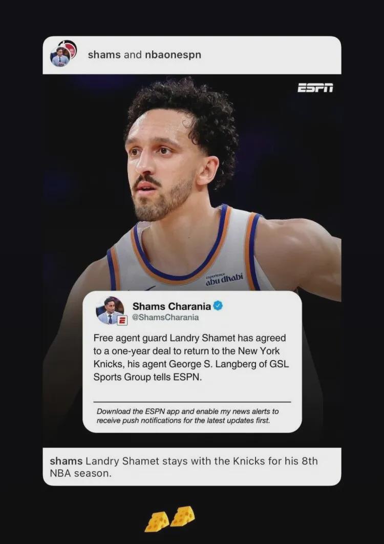 Shams:自由球员兰德里-沙梅特同意以一年合同重返尼克斯。紧接着队记Bondy补充报道,沙梅特签下的是一份无保障合同。